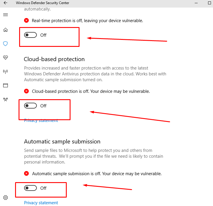 9. Selanjutnya ubah on menjadi of pada " Real Time Protection", " Cloud-Based Protection", Otomatic Sample Submission" dan jika ada pop up klik yes.
